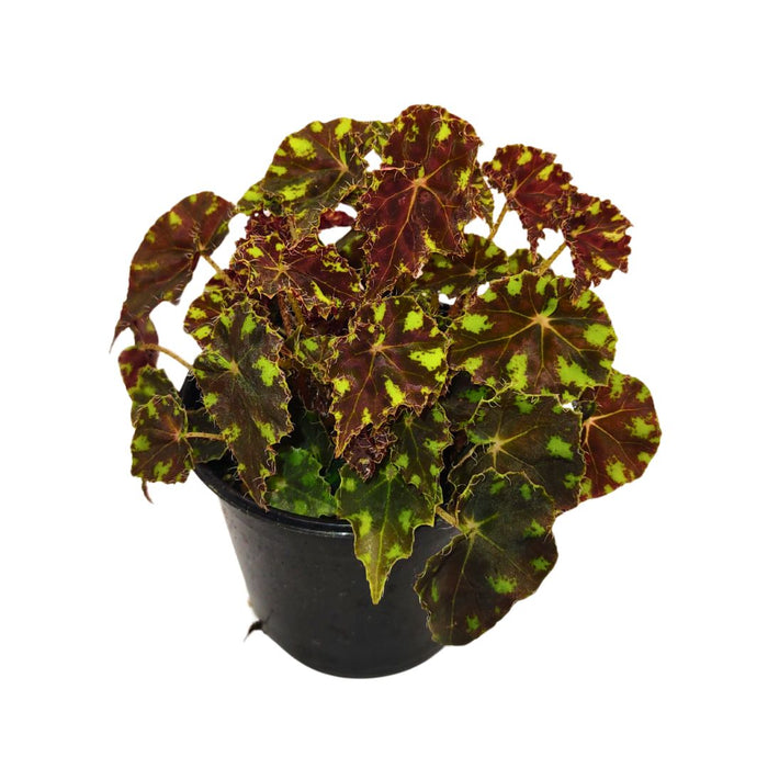 Begonia 'Tiger Paws' is a striking indoor plant, appreciated for its unique and eye-catching foliage. Its tiger paw-shaped leaves range from olive green to dark green, adorned with red to chocolate-brown markings that resemble the stripes of a wild feline. The undersides of the leaves, often tinged with red, add a subtle touch of color. Compact and bushy, this begonia makes a beautiful decorative plant, ideal for shelves, windowsills, or indoor plant arrangements. It prefers filtered light and a slightly humid atmosphere, but is easy to care for as long as overwatering is avoided.