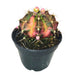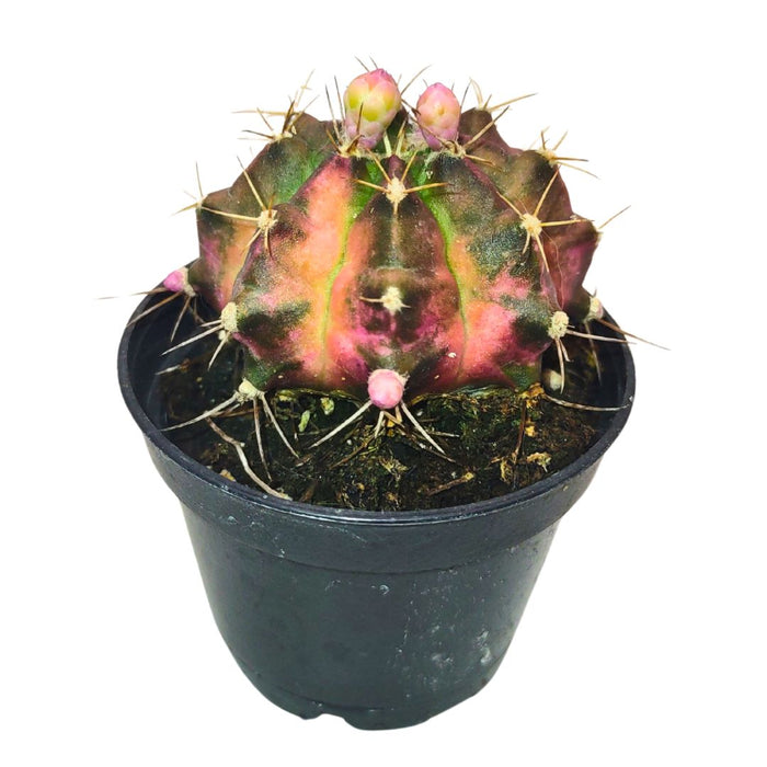 Discover the unexpected charm of Gymnocalycium mihanovichii variegata, a rare and spectacular variety known for its unique variegation combining shades of green, yellow, orange, pink, and sometimes red. Each specimen is a living work of art, with a coloration pattern that is never exactly the same. The cactus’s usual green pigments are partially or completely replaced by other vivid hues, resulting in an artistic palette highly prized by collectors.